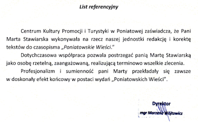 Kim jestem? Nazywam się Marta Stawiarska. Studiowałam filologię angielską ze specjalizacją tłumaczeniową (licencjat), dziennikarstwo i komunikację społeczną (magisterka) oraz public relations i marketing medialny (studia podyplomowe). Odbyłam staż zawodowy w dziale Marketingu firmy IT. Ukończyłam kurs copywritingu w agencji Content Writer, pisałam głównie artykuły blogowe. Zajmowałam się redakcją i korektą w lokalnej prasie, wcześniej tworzyłam rubrykę recenzencką. Przy wsparciu biblioteki publicznej i świetlicy profilaktyczno-wychowawczej poprowadziłam kilka edycji warsztatów dziennikarskich, od 2016 roku aktywnie brałam udział w akcji Narodowego Czytania. Chętnie użyczałam swojego głosu podczas czytania dzieciom, w fandubbingu czy audiobookach. Publikuję własne treści na platformie Wattpad, prowadzę okołoksiążkowy Instagram i TikTok. Interesuję się psychologią i true crime, chętnie uczę się języków obcych (angielski C1, francuski A1/A2). Co oferuję? redakcja tekstu: 15 zł/strona* kor...